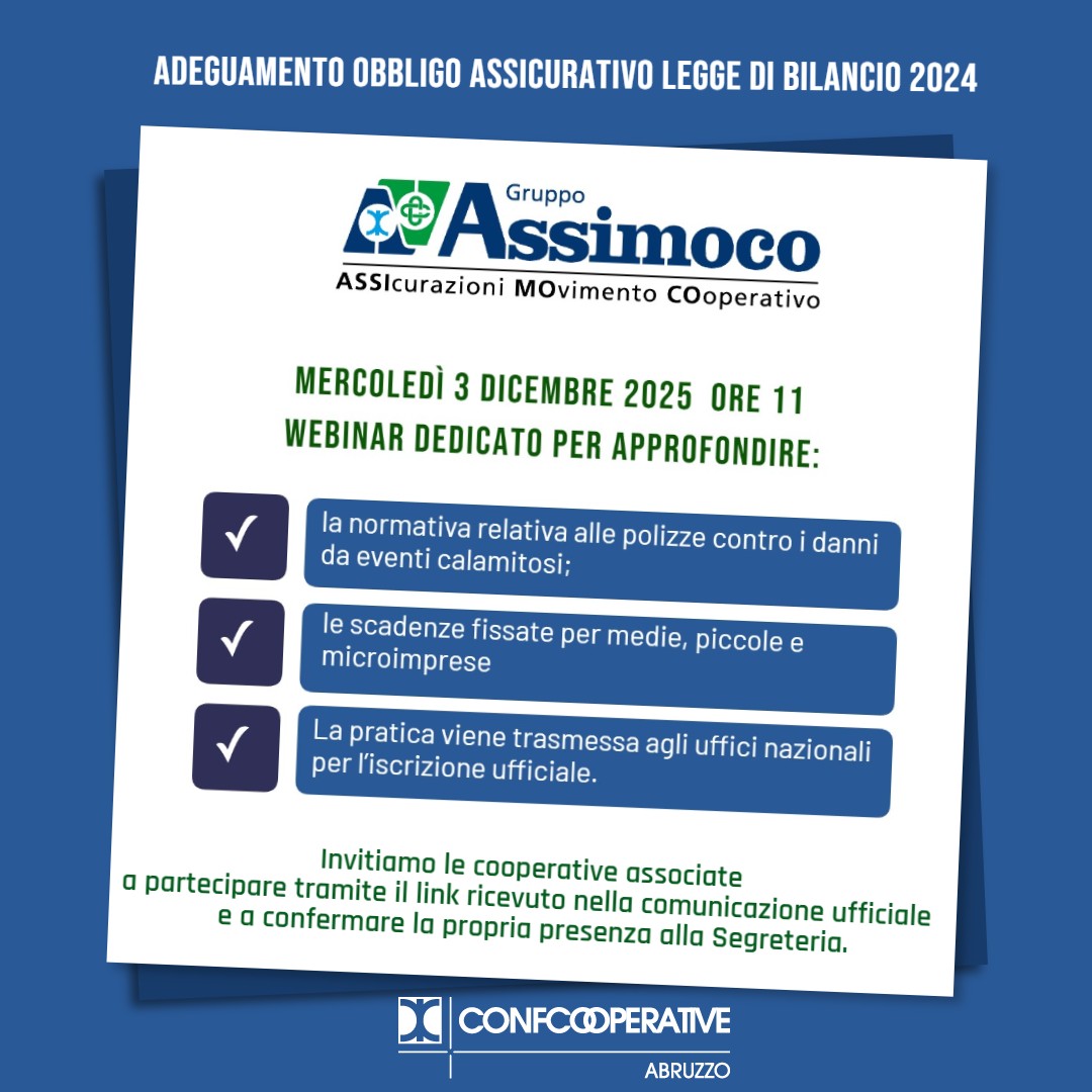 Per supportare le cooperative nell’interpretazione della norma e nella scelta delle coperture più idonee, Confcooperative Abruzzo – grazie alla collaborazione con Assimoco – ha predisposto un momento di approfondimento dedicato. Assimoco, in qualità di compagnia assicurativa del sistema cooperativo, mette infatti a disposizione prodotti specifici pensati per garantire la protezione del patrimonio delle imprese e accompagnare le associate nell’assolvimento del nuovo obbligo.