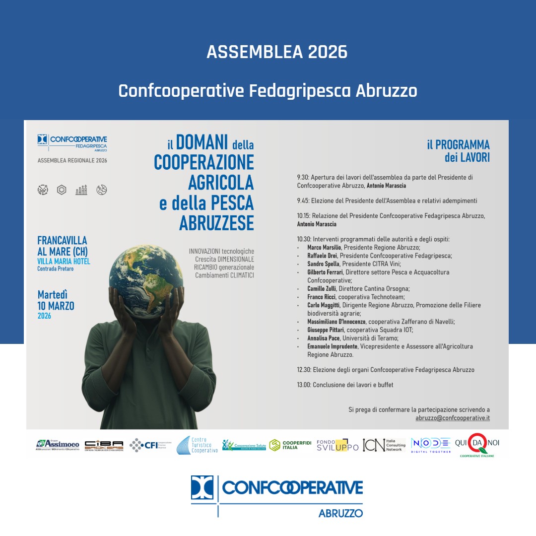Martedì 10 marzo 2026, a Francavilla al Mare (CH), presso il Villa Maria Hotel, si terrà l’Assemblea Regionale 2026 di Confcooperative Fedagripesca Abruzzo: un momento centrale di confronto, visione e programmazione per il futuro del comparto agricolo e della pesca regionale.